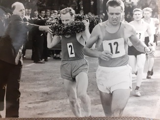 ![]() HKT:n pitkäaikainen puheenjohtaja Kallu Löfberg seppelöimässä Kaisaniemi-juoksun voittajaa 1950-luvulla. |